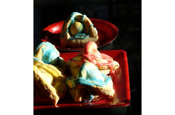 Beat eggs until foamy, then add sugar, lemon, salt, cinnamon, oil and wine. Add some flour and mix a little. Then add baking powder. Add rest of flour. Dip in wine and sugar. Bake 10 to 12 minutes at 350 degrees.