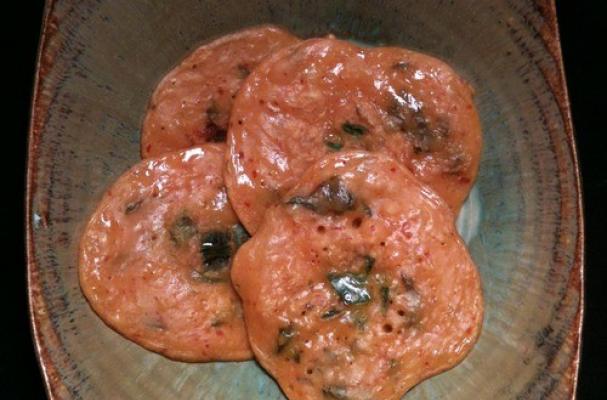 3. Add a generous amount of oil on a non-stick pan or skillet and wait until it reaches medium-high heat. Ladle the batter to fry in either one large pancake or several smaller ones, about 5 minutes or until slightly golden brown. If wanting a more aesthetic look, you can add a few chili pepper pieces in the center and then cook underside.