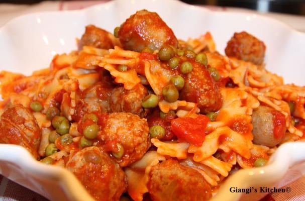 A nice plate of pasta is always welcome, adding sausages to it, makes it even more fun. Last night we just did that. Sausage pasta with peas and tomatoes sauce. Something new as we seldom have mild Italian sausages for dinner, more of a breakfast enjoyment.