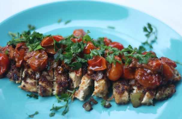 7. To serve slice chicken breasts, top with tomato cream sauce and fresh chopped parsley.