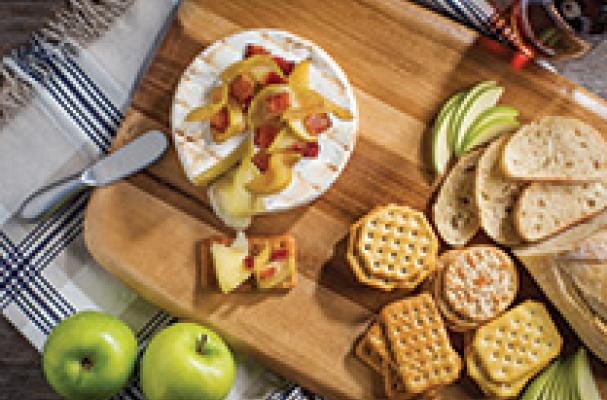 3. Preheat oven to 350°F (175°C). Line a pie dish with parchment paper or aluminum foil. Place brie on top of foil and poke holes in it with a skewer. Spoon apple mixture on top. Bake until cheese is very soft, about 10 to 15 minutes. Drizzle with remaining maple syrup and sprinkle with chives. Serve immediately with crackers.
