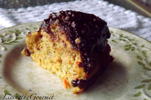 Combine sugar and butter in mixer and blend until creamy. Add yogurt, eggs (one at a time), extract and spices and continue to blend. Gradually stir in the shredded carrots and chopped nuts. Combine sifted flour with baking powder and add to the batter along with the warm water.