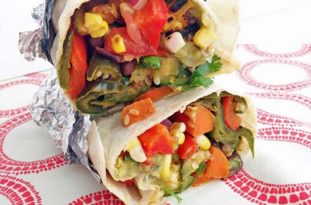 Assemble Burrito: On a flour burrito tortilla, place about ½ cup veggie and black bean mixture per burrito. Add ¼ of the cheese to each burrito. Add 1 TBSP sour cream, salsa on top on each burrito. Add 2 TBSP of guacamole and corn salsa to each burrito. Fold the edges in and roll along the long edge of the tortilla.If desired, place on foil and roll so that foil is wrapped around the burrito.