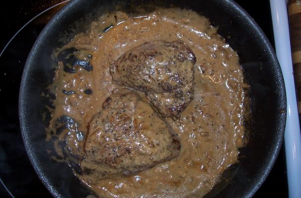 Once the sauce is thicken to this stage reduce the heat slightly and add the ½ & ½ and the sour cream and stir to combine. When the sauce is well mixed place the steaks with any juices that have accumulated back into the pan and coat with the sauce. Plate, spooning sauce over the top of each steak and serve, placing remaining sauce in a sauce boat on the side.