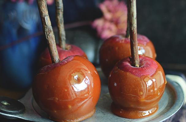 Insert an candy stick 1 inch deep into each apple. Dip apples into caramel, swirling to coat.