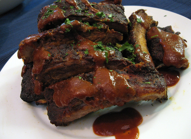 Heat barbecue sauce. Cut racks of ribs into individual pieces; arrange on serving platter, spooning some of hot sauce over. Serve accompanied by remaining barbecue and Pico de Gallo. Makes 4 servings.