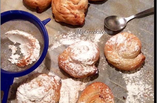 Then, take the rolled phyllo and shape into a snail, and place on a buttered oven pan. Repeat the process with the remaining custard