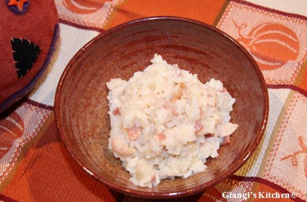 Rice is so much fun to prepare. I had half of a bottle of Champagne in the refrigerator and, as we all know, no matter how we do, the bubbles have tendency to subside after a couple of days. When preparing rice I always put a bit of white wine or champagne with the onions and bacon, why not prepare the whole rice dish with it? The result was a very pleasant combination. Taste before seasoning would be my only advise while preparing this dish. I did not add any salt to it.