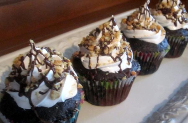 These are so very good. The cupcake is chocolatey, light and moist; the frosting is not overly sweet as most commercial marshmallow fluff is; the peanut butter filling complements the cupcake flavors; and the chocolate drizzle and peanut topping are the perfect finishing touches. Not only that, but once you see these beauties, you will WANT to eat them.