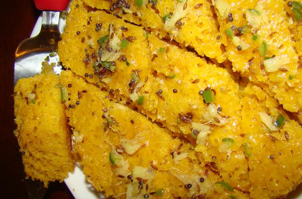 Now mix Sodium bi Carbonate/Baking soda oil and lemon juice and immediately add this to the gram flour mixture. The mixture will start frothing thanks to the baking soda and lime mixture. Pour it into the baking dish upto 1” or 2” maximum and steam for about 10-15 minutes. Mine took 15 minutes and keep checking just the way you check a cake. Use a tooth pick and pass it through and it should come clean if its done right!