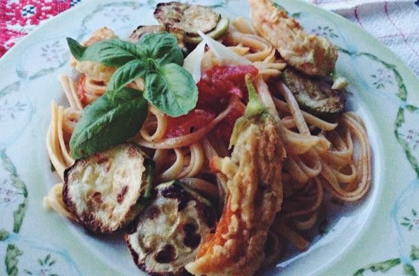 Lemon Fresh Spaghetti with Garden Sauce & Pumpkin Flowers