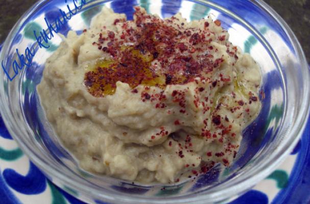 Roasted eggplant with garlic, tahini and sumac.