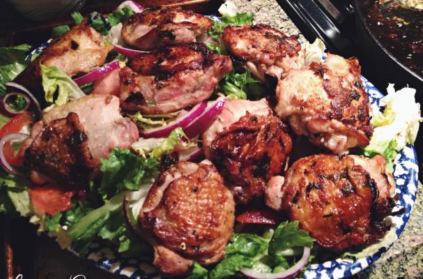 Top the salad with the chicken thighs and serve.