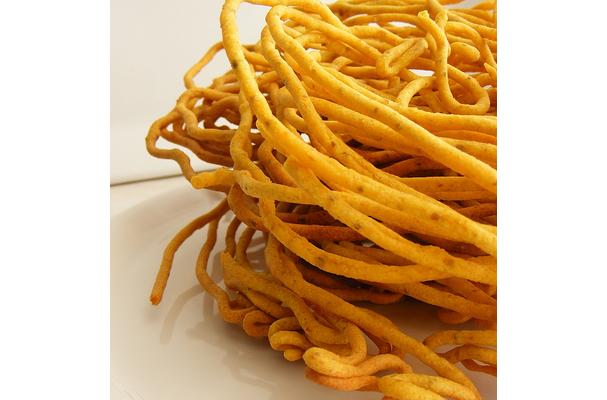 Note: A sevpress is similar to a vermicelli press, but it should be small enough to handle over hot oil.