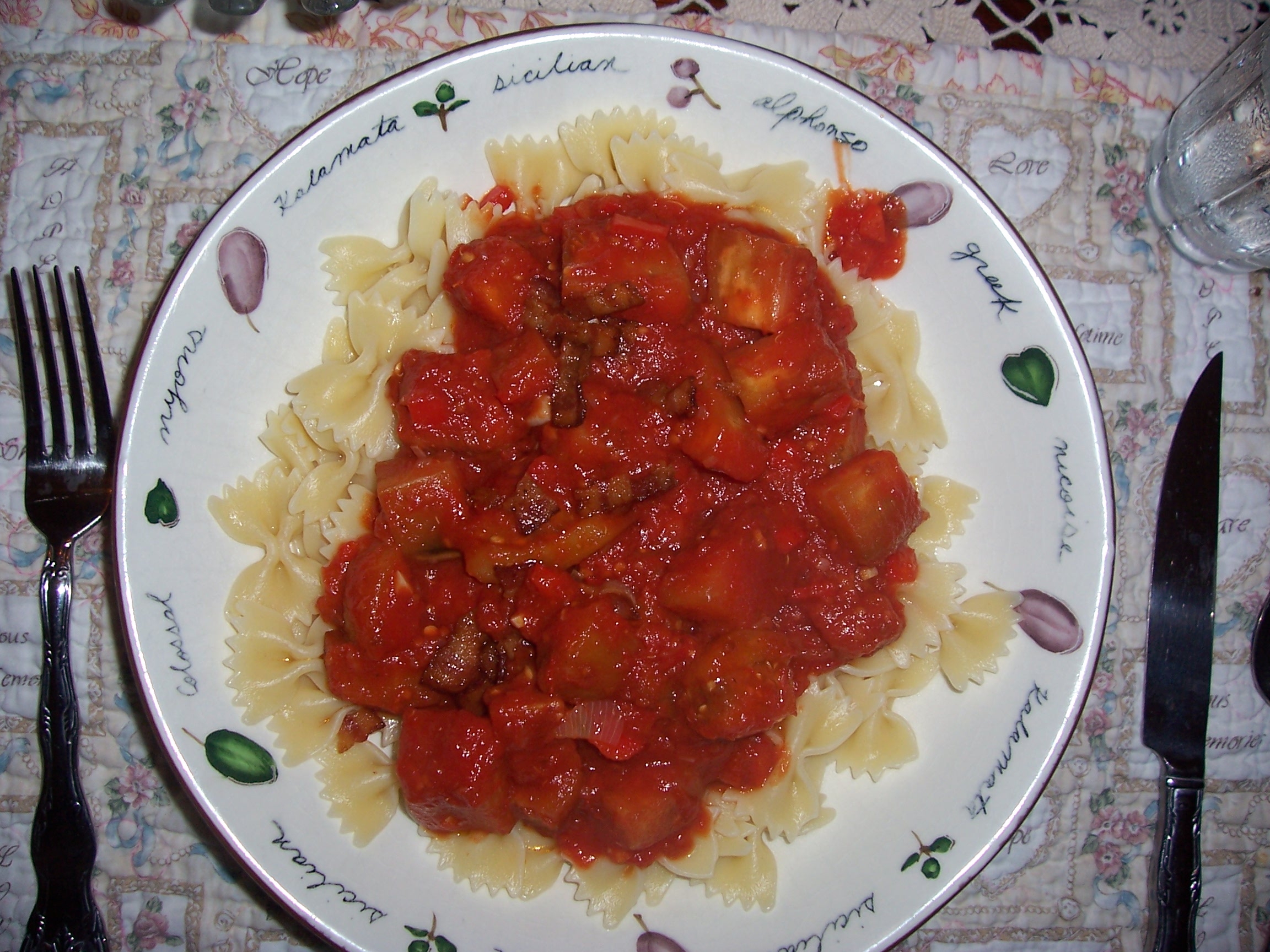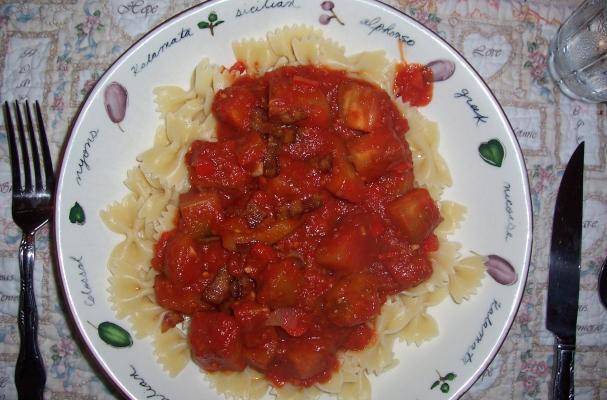 This pasta eggplant bacon & tomato is quick easy and the lesser time cooking doesn't leave the eggplant so soft. By prepping the vegetables first you can , depending on how fast your stove heats up water, cook it all in almost the same time.