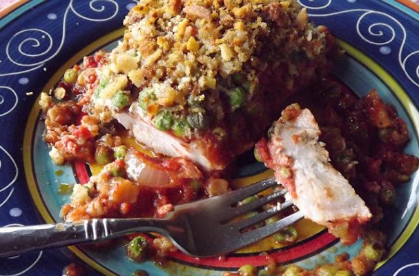Top with the sliced onions, chopped garlic, fresh basil, celery and the crushed tomatoes. Add the seasonings and peas and top with the fresh bread crumbs.