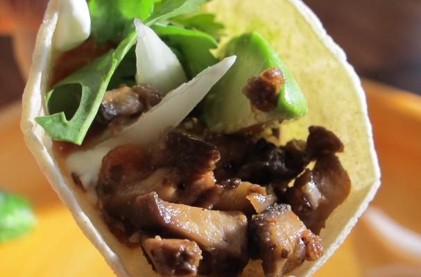 Kiddo: (the way this taco was made in the picture) Place half of the mushrooms on the tortilla. Then add avocado slices, thin sliced onions, pineapple salsa, sour cream and cilantro. Here is how I built my Taco...:)