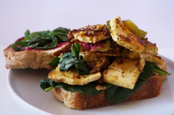 Dress the sandwich as you like it. I like mine with sauteed veggies and spinach, but if you would rather have a tofu club sandwich, use tomato, avocado and lettuce. It's your sandwich and you are the cook after all.