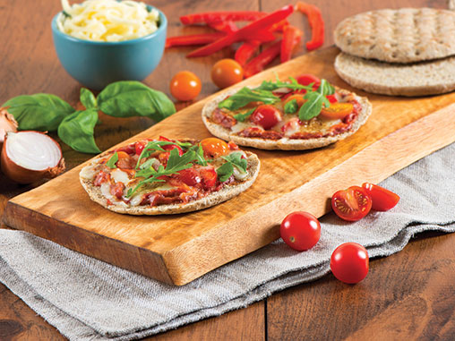 Spoon 4 tsp tomato sauce on each pita. Sprinkle with cheese. Top each with red pepper and tomatoes. Place on prepared pan.