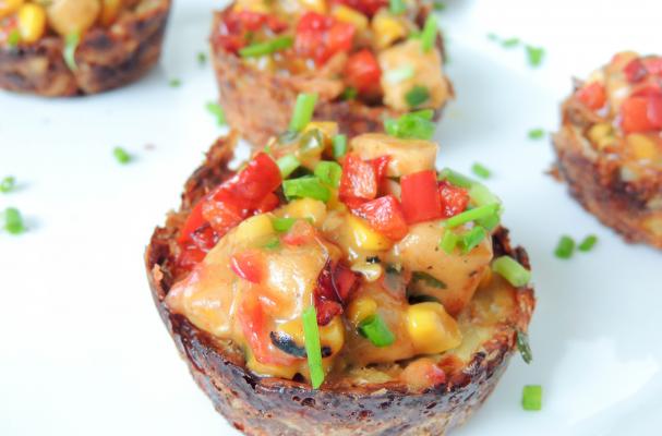 Take out the baskets from the oven, take them off the mold. Fill with the chicken mixture. Garnish with the green onions, serve right away.