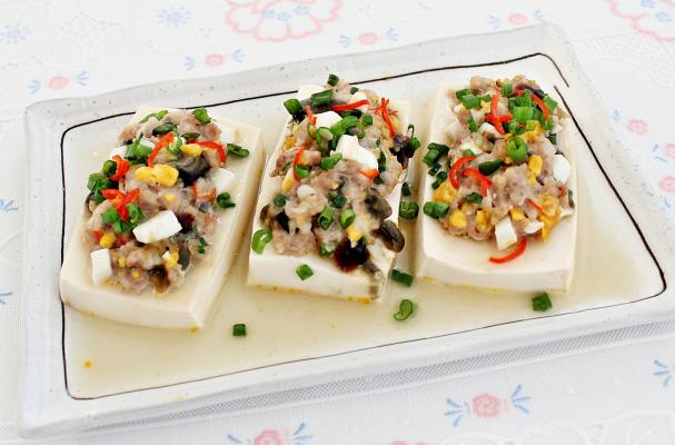 Lay a paper towel on top of the tofu and press gently to absorb moisture and cut pressed tofu into 6 slices. Place them on a steaming plate and sprinkle some corn flour on the surface of the tofu and spread about 1 tablespoon or slightly more of pork mixture on it. Steam the tofu for 10-12 minutes at high heat.