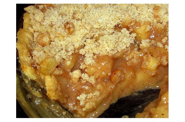 Pour apple mixture in to pie shell. Evenly coat with streusel topping. Sprinkle with fleur-de-sel (sea salt crystals).