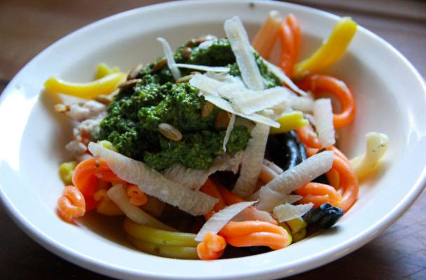 Assemble your dish in serving bowls: pasta, chicken, pesto, pumpkin seed sprinkle and shaved or grated parmesan.
