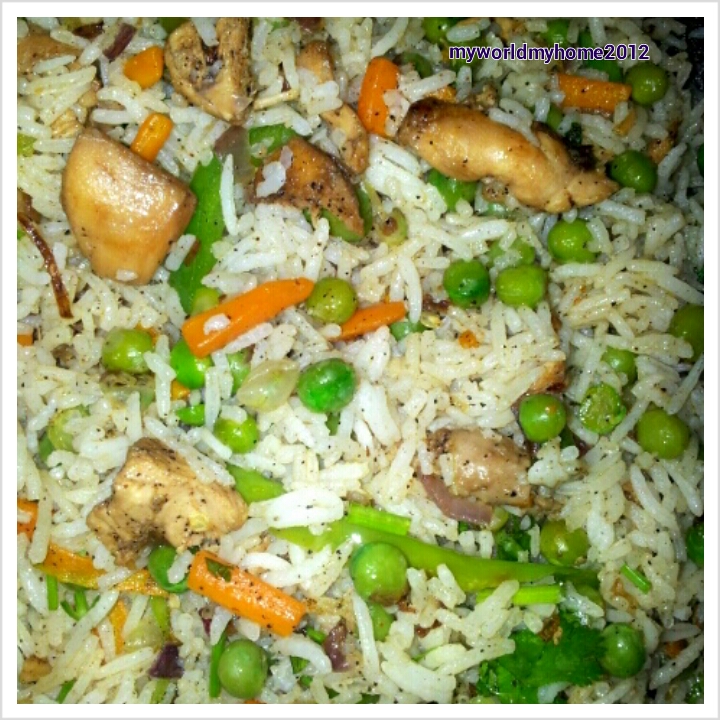 9. Chicken fried rice is ready. This rice goes well with chicken gravy or chicken manchurian.
