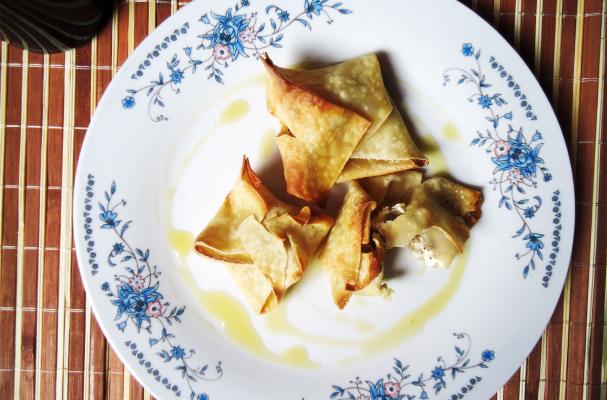 Cut in a square shape empanada pastry {about 3 inches/side}. Put a teaspoon of cream cheese, some walnuts and salt and nutmeg. Then, you must close the dough pressing one side to another, in order to the filling doesn't spill during the cooking process.