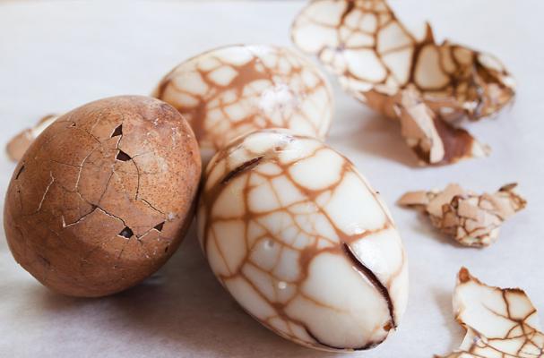 Return the eggs to the pan and add the tea leaves or bags, Chinese five spice powder, and salt. Cover the pan. Heat gently and simmer, covered, for one hour. Remove the pan from the heat and let the eggs cool down in the liquid for 30 minutes. Remove the eggs from the liquid. Peel one egg to check how dark it is; the others can be returned to the liquid if you wish to have the web-like pattern darker. Allow the eggs to cool fully.