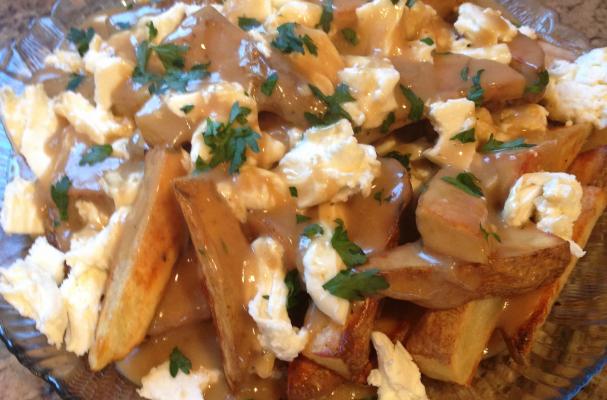 Pour the gravy over the potato wedges, top with the cheese, a little more gravy and some parsley for garnish.