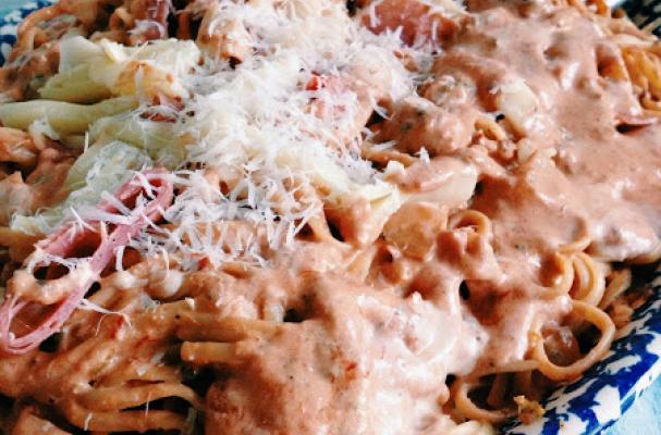 Plate the spaghetti in a serving platter. Drizzle a little olive oil; add the sliced provolone and salami and toss with the creamy sauce.