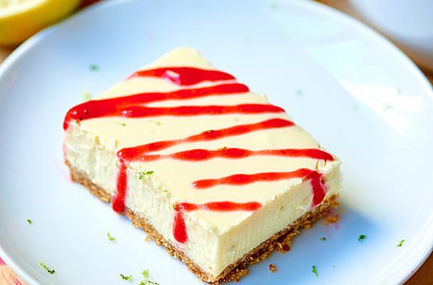Blend the fresh raspberries and sugar in a food processor until very smooth. Strain through a fine mesh strainer. This takes a little elbow grease. Use a spatula to press the mixture through. You should end up with about ½ cup raspberry sauce. Place in a squeeze bottle and drizzle over the bars!