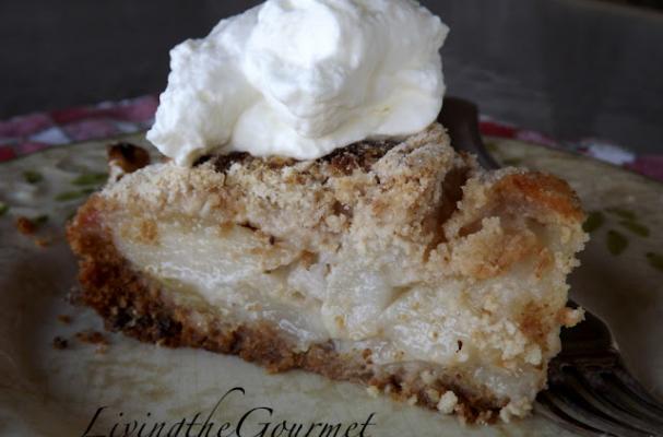 For the topping combine the flour, butter and brown sugar in a bowl and crumble this with your fingers, until it is in little bits. Place this mixture on top of the pie.