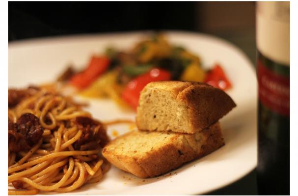 The Penne with bacon is one of the lighter pasta dishes (most of the others are heavy on cheese and are baked) and has a slightly spicy touch to it. Since Ak is not a Spicy food person, I skipped the dried red chilies and did my own take on it with some left over red wine. Further, I used spaghetti instead of Penne– simply for its appeal as comfort food. The results were suitably impressive- if I may say so myself, and the accompanying grilled peppers were a brilliant addition to the otherwise unadorned meal. The vegetables are just something that I have cooked up- from my understanding of Italian ingredients. Have been quite the winner, almost everytime I have cooked them. Feel free to improvise!