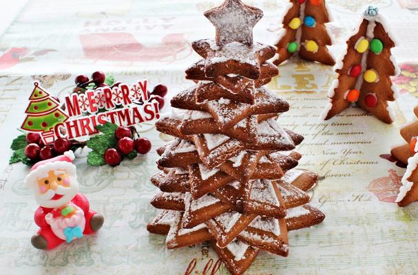 Dust some icing sugar on cookies and stack them into tree shape. Attach tree topper with some royal icing.