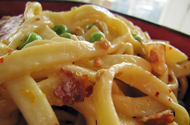 2012 is the start of a whole new era for us, an era filled with heaping mounds of fresh, homemade pasta, thanks to my new Christmas present, a shiny, beautiful, Atlas 150 Pasta Maker. This is something we have been wanting for a long time, and I have to say, it is well worth the 85 bucks, especially if you make pasta a lot. These noodles taste shockingly delicious right out of the boiling water! After a trial run or two to get used to the process, we officially celebrated this appliance’s homecoming into our kitchen by making one of our favorite, and very distinctive, Italian pasta dishes. This is our heavily modified, and even more flavorful, take on a pasta recipe from Bon Appetit. With the prominent orange flavor and complimentary spiciness and saltiness of red pepper and prosciutto, add some peas for depth and color, it is surprising how addictive this dish can be, given the unusual flavor profile.