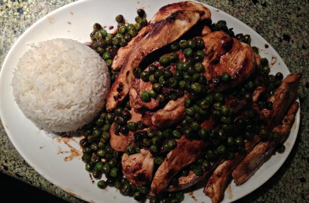 Plate the chicken and top with the peas and the side of rice.