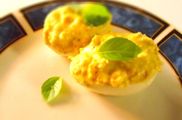Deviled eggs with shrimp, yellow mustard and basil.