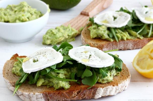 Place the toasted bread onto a plate & spread the avocado mix over. Top with arugula leaves and a few slices of goat cheese.