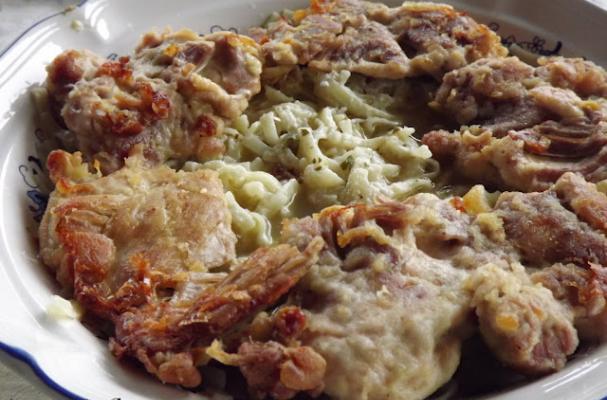Place the noodles in a serving bowl and using a net, strain the soup over the noodles. Squeeze half a lemon over the noodles, one tablespoon of butter and grated Romano cheese. Serve with the baked chicken thighs.