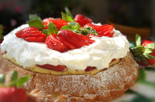 Brush cooled cake with strawberry preserves and top with custard. Arrange strawberries in a circular pattern and cover with whipped cream. Decorate with additional berries and mint leaves. Dust edges of cake with confectioners' sugar.