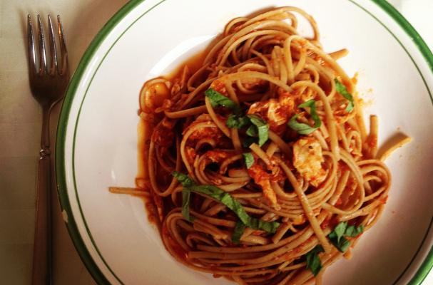 Stir in the chicken and simmer another 10 minutes or so. Toss in al dente cooked linguini with the sauce. Finish off with more fresh chiffonade basil.