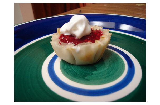 Brush melted butter on the first sheet of filo. Lay a second square on top at an angle to form a star shape, and brush with butter. Lay on a third quare, again at an -angle so that all 12 points are showing.