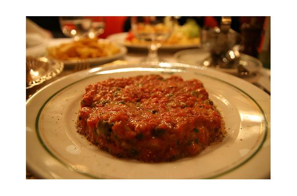 Mix meat, egg, onion, salt and pepper sauce. Set oven control at broil and/or 550 degrees. Butter one side of each bread slice. Broil 3 inches from heat until bread is toasted. Turn; cover unbuttered side with meat mixture. Broil 1-2 minutes for rare, 2-3 minutes for medium. Cut each bread slice into 9 bite-size pieces. 45 appetizers.