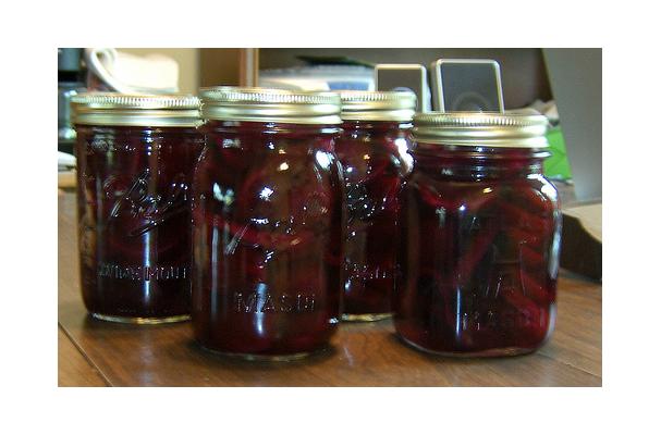 Pull beets when about the size of golf ball or bigger. Always hand twist off tops and leave on the roots. Wash and put in a large kettle. Cover with water; boil until the skins slip off real easy, maybe an hour or more. Remove from heat and put in cold water. Peel off skins and roots. Cut in quarters. Wash off beets and put in an enamel or stainless steel dish pan.