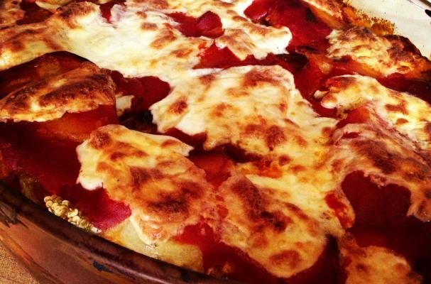 Time to layer! Start with a layer of sauce, continue with a layer of potatoes, eggplant then mozzarella. Continue until all the potatoes and eggplant are used, ending with sauce then mozzarella. Bake for approx 25-30 minutes until bubbly and the cheese is beautifully golden!