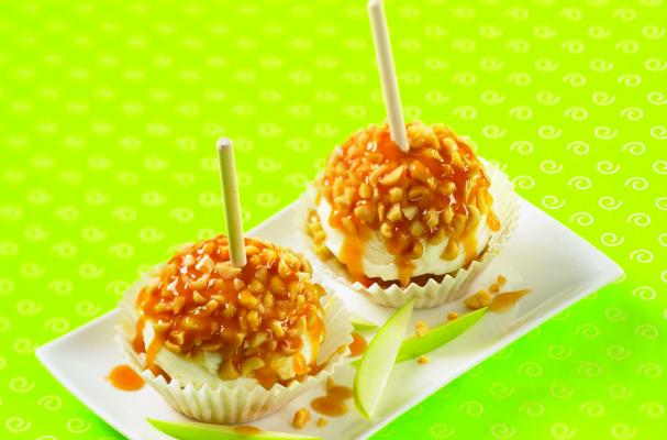 Freeze 10 minutes or until firm. Scoop the remaining vanilla ice cream on top. Sprinkle with peanuts and cover with syrup. Insert sticks into the cupcakes and freeze until firm, about two hours. Makes 6 caramel apple cupcakes.