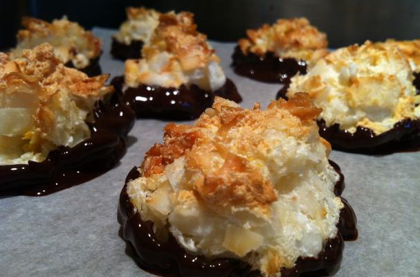 These coconut macaroons get a decadent dip in dark chocolate. Taste sinful without all the calories. Not those Passover macaroons, these are light, airy and have a hint of lemon. Best when chilled to get a nice bite of coconut with the rich chocolate.