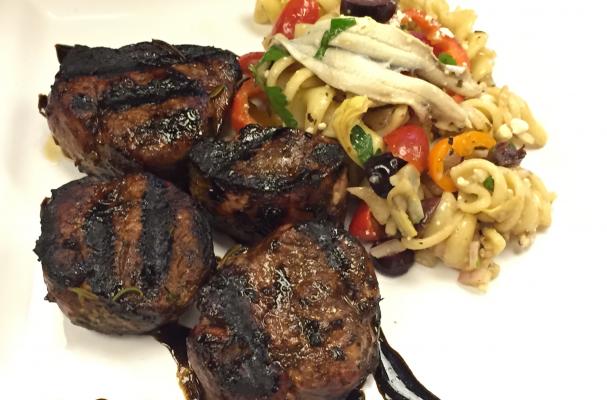 Grilled Pork Medallions with Honey - Balsamic Glaze and Pasta Salad